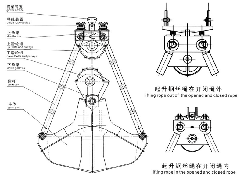 在各類起重機(jī)上,配有兩組電機(jī)卷筒(即電動葫蘆),每組卷筒引出兩根鋼絲繩,其中兩根組成一組分別生根在抓斗平衡架端作支持用,另一組鋼絲繩經(jīng)過上橫梁的滑輪與下橫梁的滑輪,組成滑輪組,起開閉斗部作用。