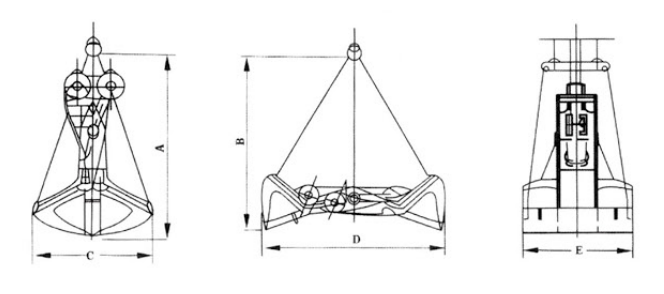 剪式抓斗是把兩個顎板靠鉸點的端部延長為繩索式加力臂,兩臂公用一個叫中心鉸點,剪式抓斗開啟動作依靠放松剪臂處滑輪組的鋼絲繩,收緊支撐繩來完成,關閉動作依靠收緊滑輪組的鋼絲繩嗎,利用杠桿原理增力,是顎板閉合抓取物料,其閉合力矩隨著閉合過程逐漸增加,抓取物料時干凈不漏料,多用在大型橋式卸船機上。
