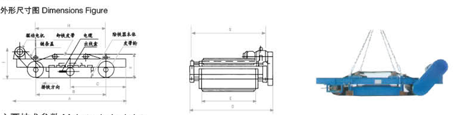 | 產(chǎn)品型號 | 對應(yīng)行標型號 | 標準架設(shè)高度(mm) | 輸送皮帶寬度 (mm) | 額定電壓(V) | 冷態(tài)消耗功率(KW) | 自重(kg) | 外形尺寸(mm) | 卸扣 | 驅(qū)動電機容量 | 配套電控(單臺除鐵器用) | ||||||||