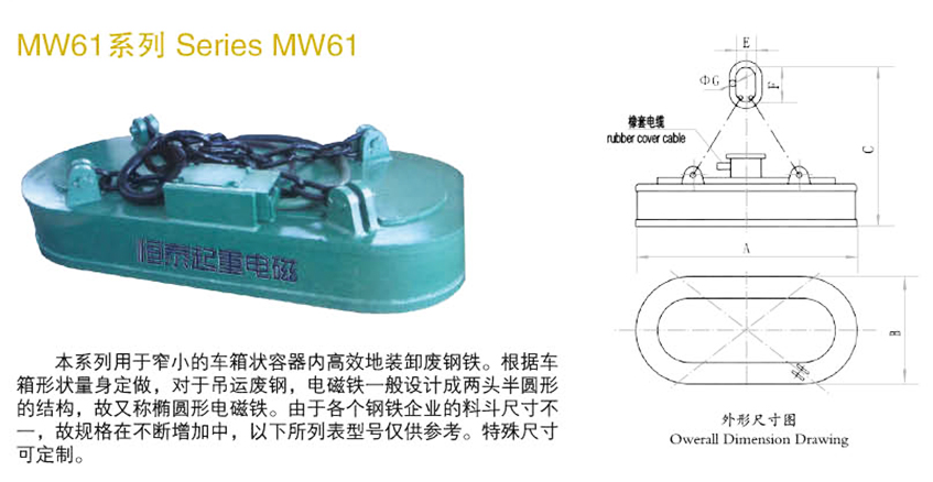 本系列用于窄小的車箱狀容器內高效的裝卸廢鋼鐵。根據車箱形狀量身定做,對于吊運廢鋼,電磁鐵一般設計成兩頭半圓形的結構,故又稱橢圓形電磁鐵。用于各個鋼鐵企業的料斗尺寸不一,故規格在不斷增加中,特殊尺寸可定制。